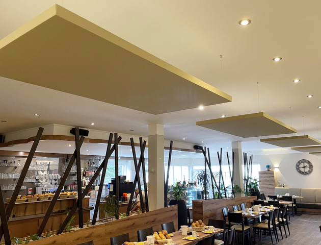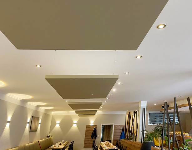 Der Klang glatter und harter Oberflächen, großer Fester- & Glasflächen oder einer nackten Beton-Decke kann erschrecken. Schallwellen breiten sich ohne Hindernis aus und langer Nachhall macht den Speisesaal zur Kathedrale. Mit dekorativen Absorbern an der Decke – wahlweise mit Beleuchtungselementen kombiniert – wird der Schall geschluckt und aus dem Großraum-Restaurant wird akustisch ein angenehmes Wohnzimmer.